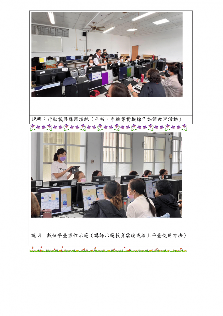 (1)推廣族語教師熟悉科技輔助自主學習理念與教學實施模式 :實際參與人數 245 人,超過原預期 210 人(達成率約 116.7%), 基礎課程與進階課程並行,涵蓋「科技輔助自主學習概論」、「數位學習平臺應用」等核心主題,讓參與教師能立即將數位科技融入族語教學 。 (2)提升族語教師數位科技、平臺及資源運用於課堂實踐的能力 :工作坊後,部分教師已在族語課程中運用 Google Classroom 、教育雲端資源與即時互動工具(如 Padlet 、 Kahoot ); 多位教師於研習回饋表示願意在學期內嘗試至少 1 次數位融入課堂專案。 (3) 協助族語教師與教學支援人員導入行動學習:提供平板與行動載具操作示範,讓教師能進行族語教學活動設計(如拍攝族語短片、線上合作翻譯等)。 (4)發展本土語文跨領域多元創新教學模式:進階課程「PBL 教學應用工作坊」與「各領域數位教學工作坊」引導教師結合族語與自然、社會、藝術領域製作數位專案,促進跨領域教學。 (5)數位科技應用於族語保存與傳承:多數教師嘗試錄製族語故事音檔、拍攝教學影片,並上傳至教育雲或學校網站,增加族語文化資源的可見度與可持續性。  |
